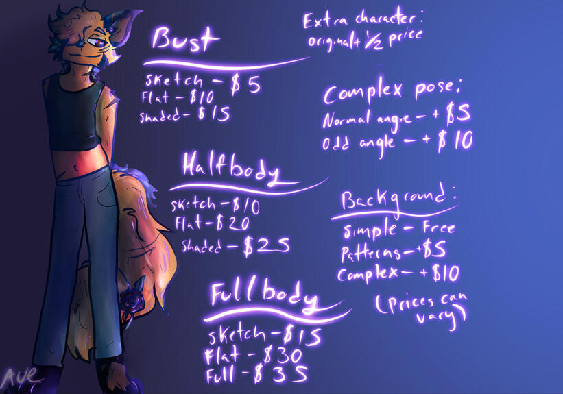 • I will not start drawing until you have paid me at least half of the cost of the drawings.• If you don't pay fully, you will no longer be able to get art from me• My art is for personal use only. Do not sell anything with my art on it.• You may redesign customs however you please as long as it still resembles the original character.• If you plan to share or repost my art anywhere please give me proper crediting that links you to at least one of my social media.• I have the right to refuse or stop a commission.• I am allowed to post the art I make you anywhere, unless you tell me beforehand.• I will only take USD $ sent from PayPal• Do not remove my watermark, trace, copy, edit, or claim my art as your own.• You can sell adopts or Customs I have made you as long as you credit me for the original design and they cost no more than you get them for, unless you have art added to it.